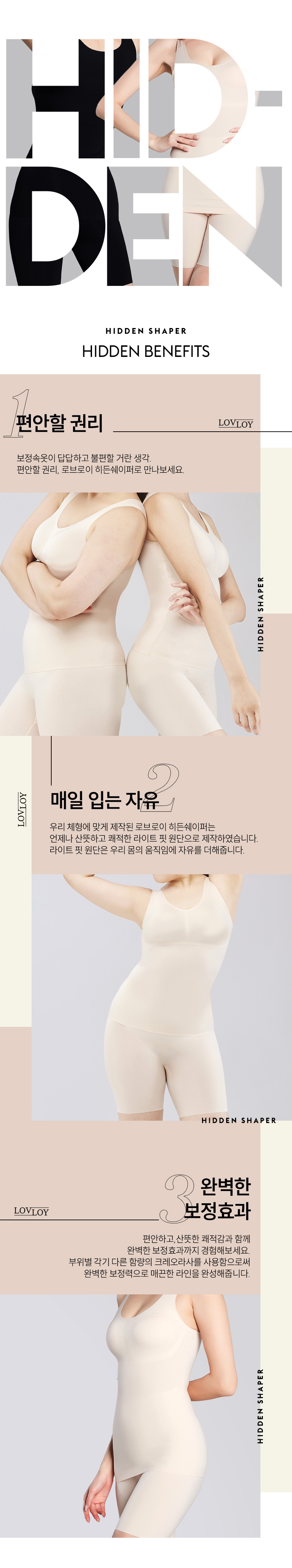가슴볼륨 업 보정 / 아랫배 보정 라운딩 / 편안한 숄더 밴드 / 핫멜트 퓨징공법 / 크레오라사 원단(54%사용) / 우수 통기성 파워넷 원단 / 분리형패드